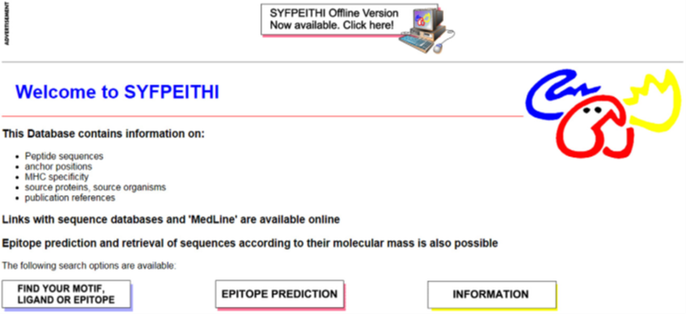 یکی از اولین پایگاه داده های عمومی موجود برای لیگاندهای MHC و موتیف های پپتیدی SYFPEITHI است. پایگاه داده ای از توالی های پپتیدی شناخته شده است که به مولکولهای MHC کلاس I و II متصل شده اند. این پایگاه در سال 1999 توسط گروه هانس-گئورگ رزامی (Hans-Georg Rammensee’s group)در انستیتوی زیست شناسی سلولی ، دانشگاه توبینگن(University of Tübingen) پایهگذاری شد. این پایگاه شامل بیش از 7000 لیگاند MHC ، موتیف و اپی توپ های سلول T میباشد، پایگاه داده به منظور تسهیل جستجوی پپتیدها و کمک به پیش بینی اپی توپ های سلول T است. هر داده ذخیره شده ، اطلاعاتی در مورد منبع و مرجع ارائه می دهد.