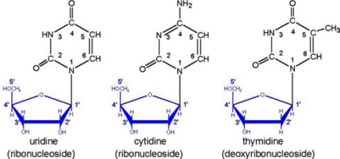 2) RNA (ریبونوکلئیک اسید) دارای قند 5 کربنه ریبوز بوده در حالی که DNA (دئوکسی ریبو نوکلئیک اسید) از قند 5 کربنه دئوکسی ریبوز (حذف گروه هیدروکسیل -OH کربن دو) ایجاد شده است.