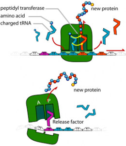 ین از سایت P به محل A منتقل می شود تا به اسید آمینه جدید در آنجا پیوند یابد و بنابراین پروسه طویل شدن پپتید آغاز می شود. مولکول tRNA موجود در سایت P دیگر اسید آمینه متصل ندارد و بنابراین ریبوزوم را ترک می کند.