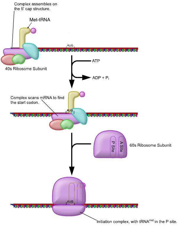 در کلاه 5’ مولکول mRNA ، زیر واحد کوچک s 40 ریبوزوم متصل می شود. پس از آن ، زیر واحد بزرگ تر s 60 متصل می شود تا کمپلکس آغاز را تکمیل کند. مرحله بعدی (طویل شدن)، پس از کمپلکس آغاز می تواند ادامه یابد.